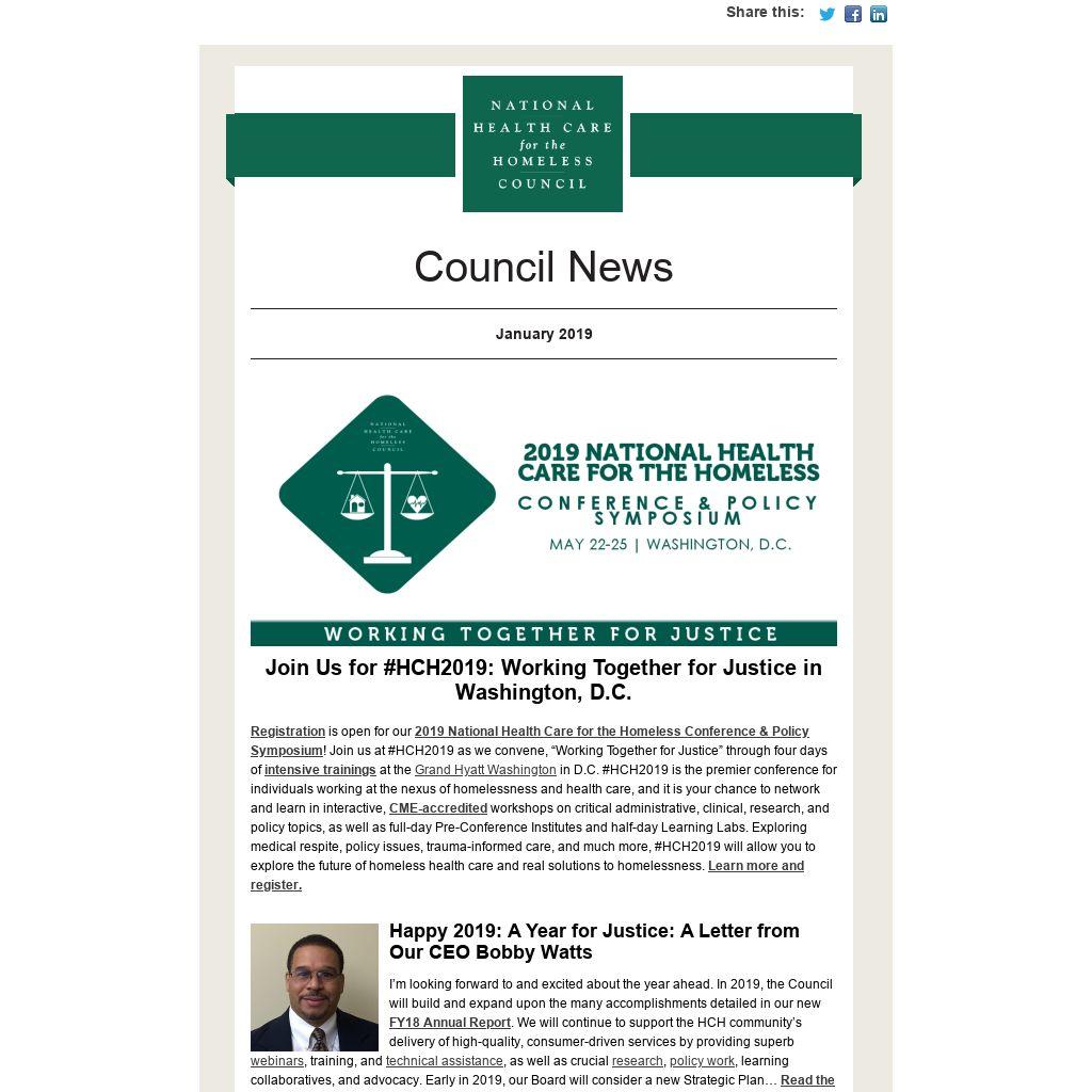 | Happy 2019: A Year for Justice: A Letter from Our CEO Bobby Watts I’m looking forward to and excited about the year ahead. In 2019, the Council will build and expand upon the many accomplishments detailed in our new FY18 Annual Report. We will continue to support the HCH community’s delivery of high-quality, consumer-driven services by providing superb webinars, training, and technical assistance, as well as crucial research, policy work, learning collaboratives, and advocacy. Early in 2019, our Board will consider a new Strategic Plan… Read the full letter.