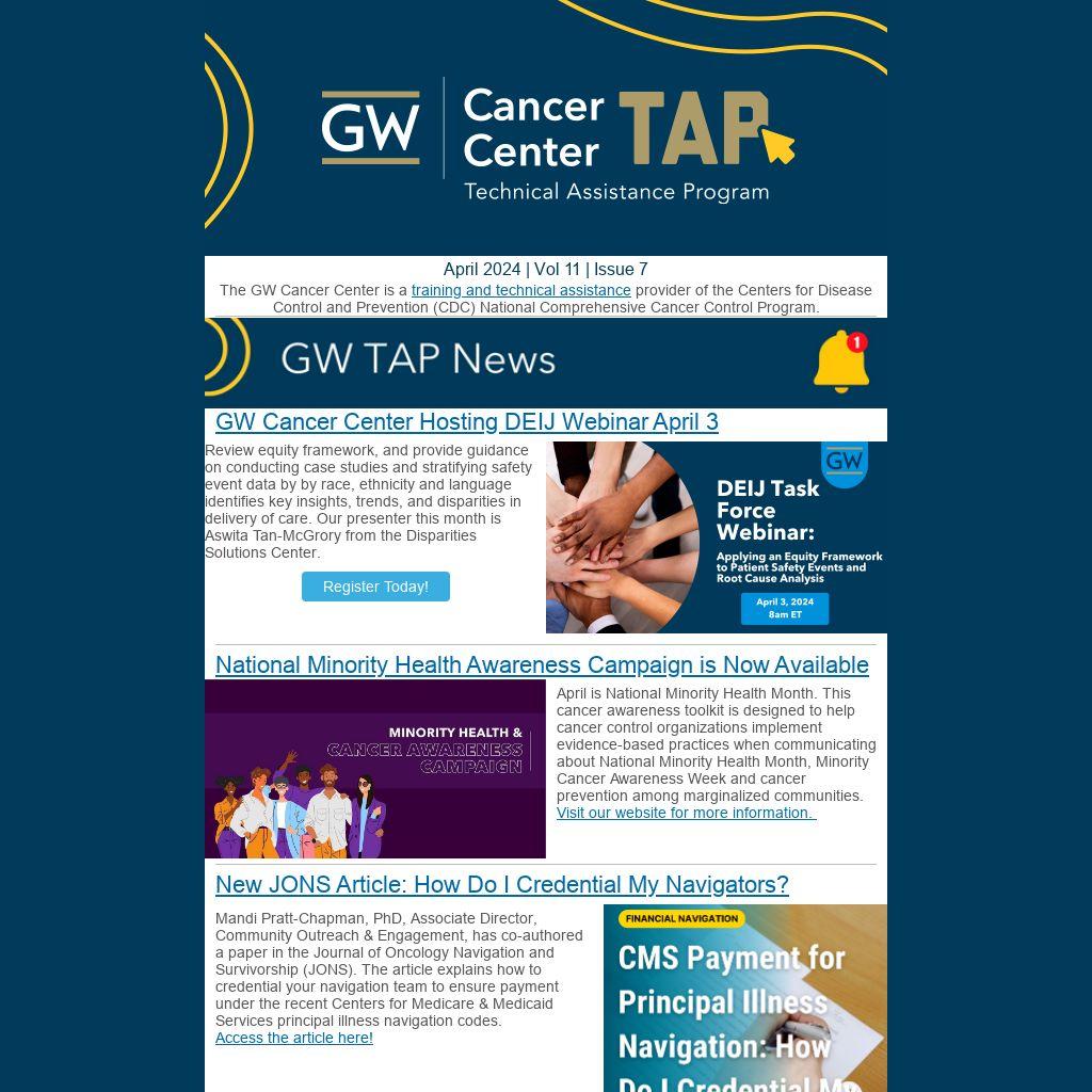 The GW Cancer Center is a training and technical assistance provider of the Centers for Disease Control and Prevention (CDC) National Comprehensive Cancer Control Program.
