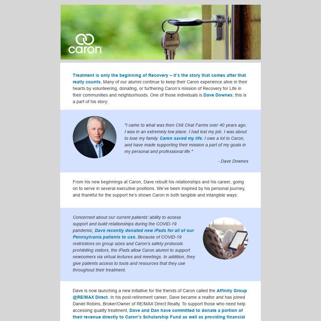 Concerned about our current patients’ ability to access support and build relationships during the COVID-19 pandemic, Dave recently donated new iPads for all of our Pennsylvania patients to use. Because of COVID-19 restrictions on group sizes and Caron’s safety protocols prohibiting visitors, the iPads allow Caron alumni to support newcomers via virtual lectures and meetings. In addition, they give patients access to tools and resources that they use throughout their treatment.