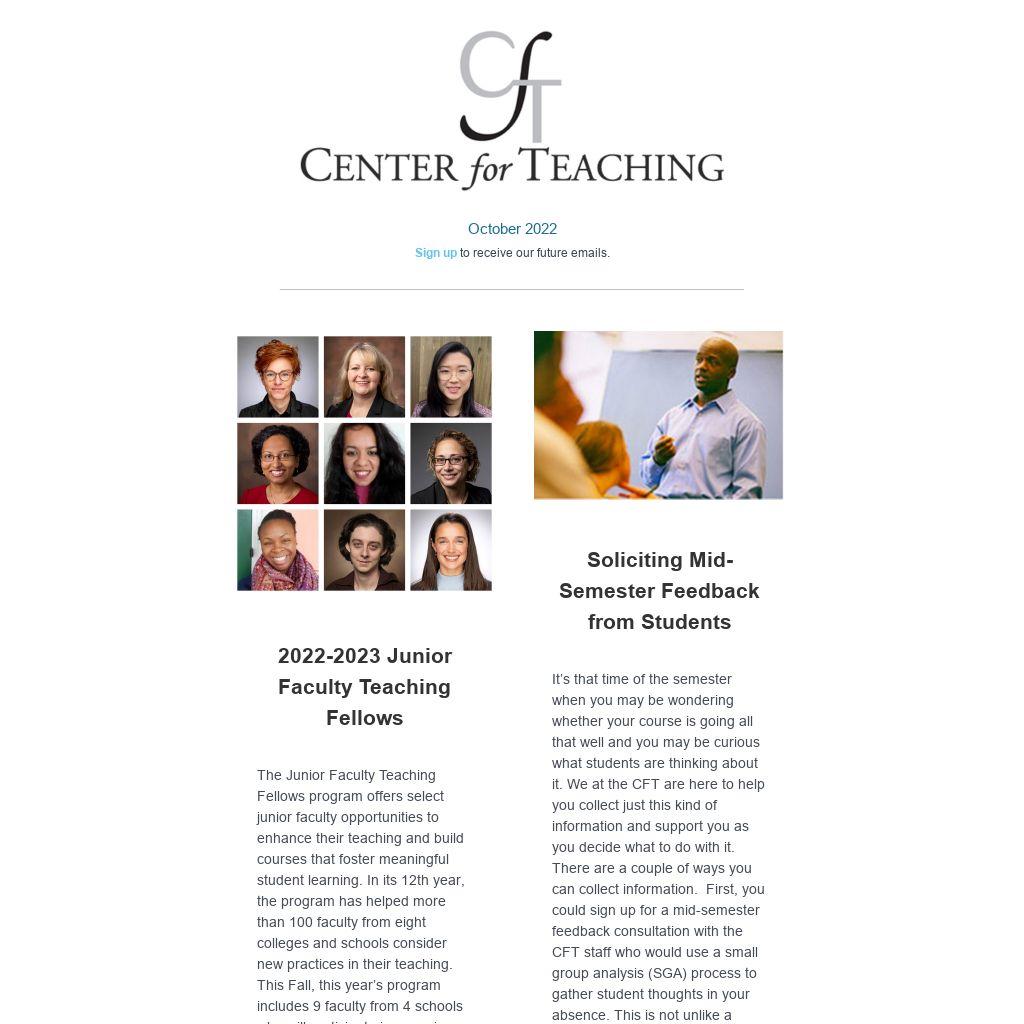 It’s that time of the semester when you may be wondering whether your course is going all that well and you may be curious what students are thinking about it. We at the CFT are here to help you collect just this kind of information and support you as you decide what to do with it. There are a couple of ways you can collect information. First, you could sign up for a mid-semester feedback consultation with the CFT staff who would use a small group analysis (SGA) process to gather student thoughts in your absence. This is not unlike a focus group process, which is described further here, and it only takes twenty minutes of class time. Second, you could collect the information via an anonymous survey that you conduct yourself. If you prefer this option, you might benefit from reading a guide on how to do this by former CFT Graduate Teaching Fellow, Robert Marx, “Soliciting and Utilizing Mid-Semester Feedback.” Whichever method you choose, we are happy to help you make sense of the results and what, if anything, you might like to change in your teaching. If you would like to schedule a mid-semester feedback consultation, please call Juliet Traub (615-322-7290) or write to us here.