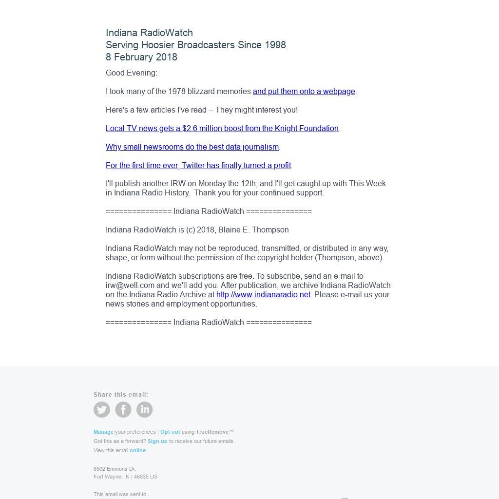 Indiana RadioWatch subscriptions are free. To subscribe, send an e-mail to irw@well.com and we'll add you. After publication, we archive Indiana RadioWatch on the Indiana Radio Archive at http://www.indianaradio.net. Please e-mail us your news stories and employment opportunities.