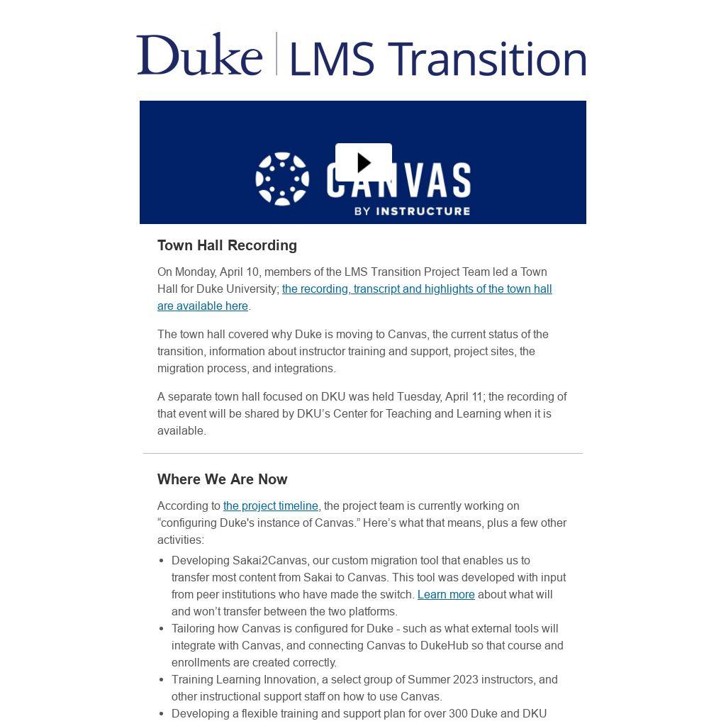 On Monday, April 10, members of the LMS Transition Project Team led a Town Hall for Duke University; the recording, transcript and highlights of the town hall are available here.