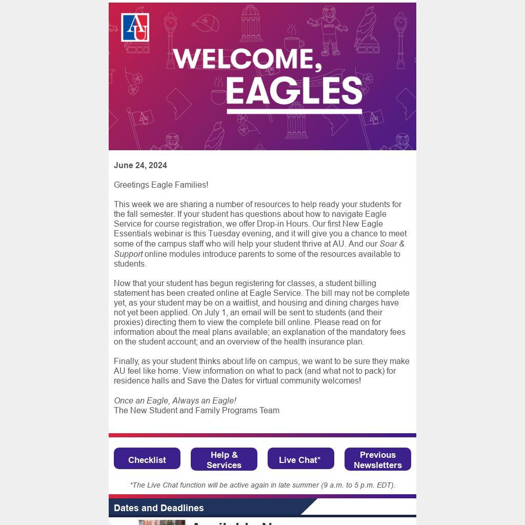 This week we are sharing a number of resources to help ready your students for the fall semester. If your student has questions about how to navigate Eagle Service for course registration, we offer Drop-in Hours. Our first New Eagle Essentials webinar is this Tuesday evening, and it will give you a chance to meet some of the campus staff who will help your student thrive at AU. And our Soar & Support online modules introduce parents to some of the resources available to students.