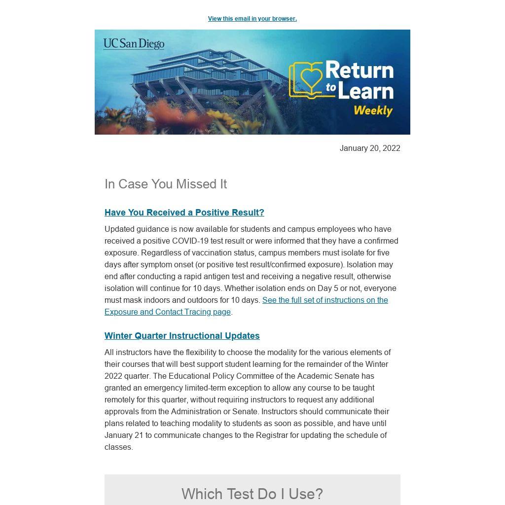 - Individuals who are not UC San Diego staff, faculty or employees but live in UC San Diego housing or work on campus: you may be eligible for no-cost testing through a provider-administered testing site, such as at the Price Center clinic or a drive thru location. Contact RTL@ucsd.edu to determine if you are eligible.
