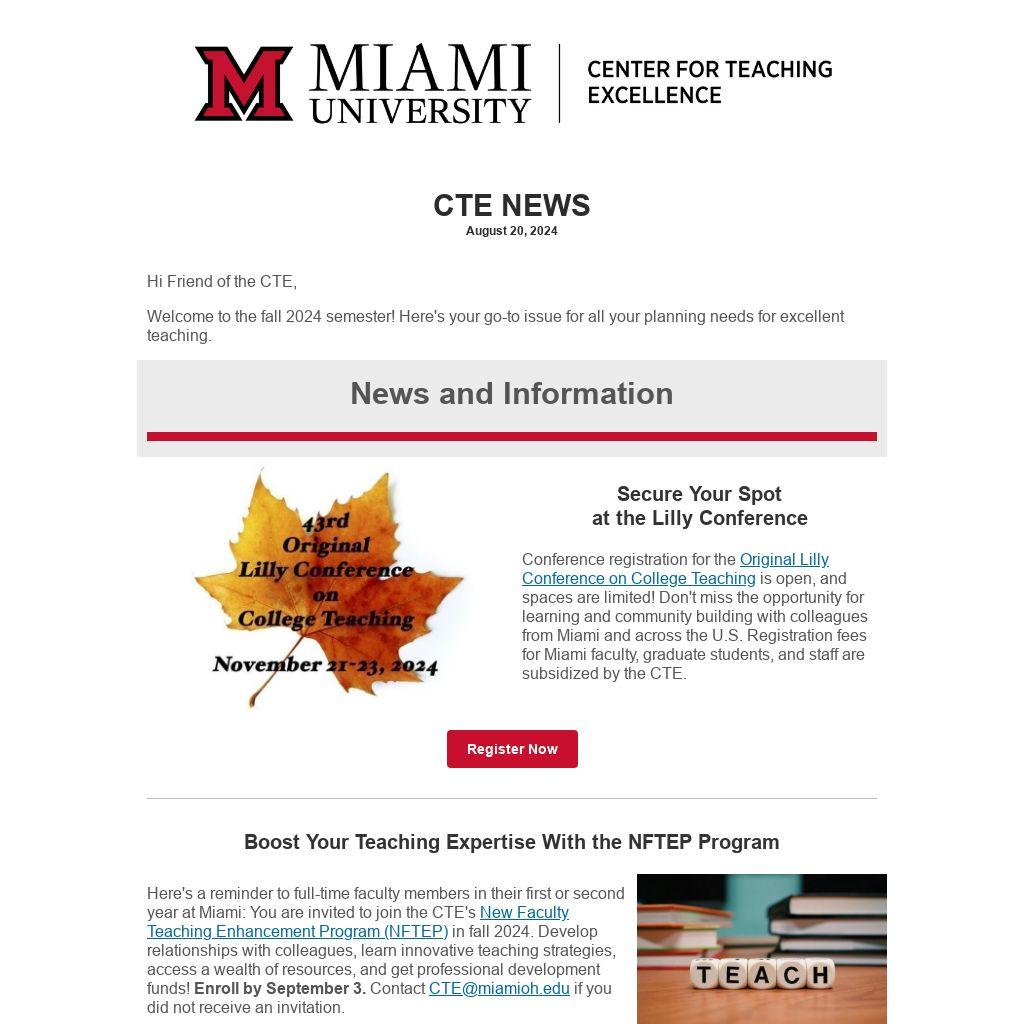 Here's a reminder to full-time faculty members in their first or second year at Miami: You are invited to join the CTE's New Faculty Teaching Enhancement Program (NFTEP) in fall 2024. Develop relationships with colleagues, learn innovative teaching strategies, access a wealth of resources, and get professional development funds! Enroll by September 3. Contact CTE@miamioh.edu if you did not receive an invitation.