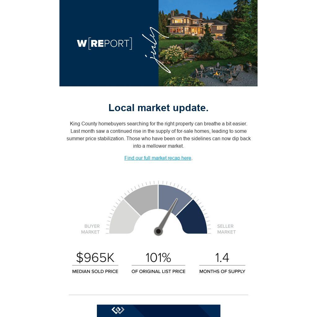 King County homebuyers searching for the right property can breathe a bit easier. Last month saw a continued rise in the supply of for-sale homes, leading to some summer price stabilization. Those who have been on the sidelines can now dip back into a mellower market.