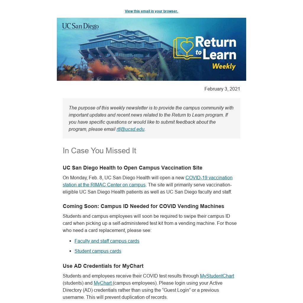 Answer: The RIMAC site will serve eligible UC San Diego Health patients, as well as eligible UC San Diego employees and community members. Currently students are not yet eligible. Eligibility is determined by guidelines issued by the California Department of Public Health, County of San Diego and other agencies. You can see all of the state’s guidelines at