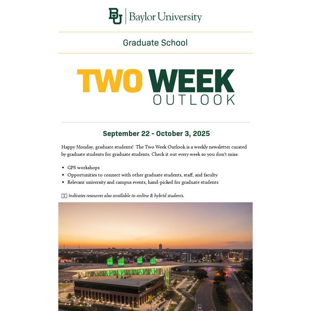 Happy Monday, graduate students! Â The Two Week Outlook is a weekly newsletter curated by graduate students for graduate students. Check it out every week so you don't miss: