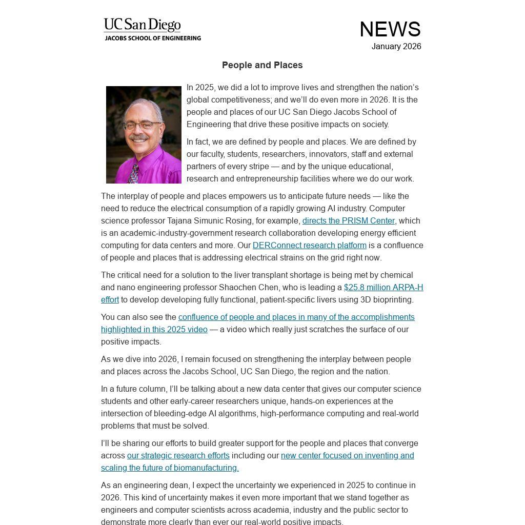 In 2025, we did a lot to improve lives and strengthen the nation’s global competitiveness; and we’ll do even more in 2026. It is the people and places of our UC San Diego Jacobs School of Engineering that drive these positive impacts on society.