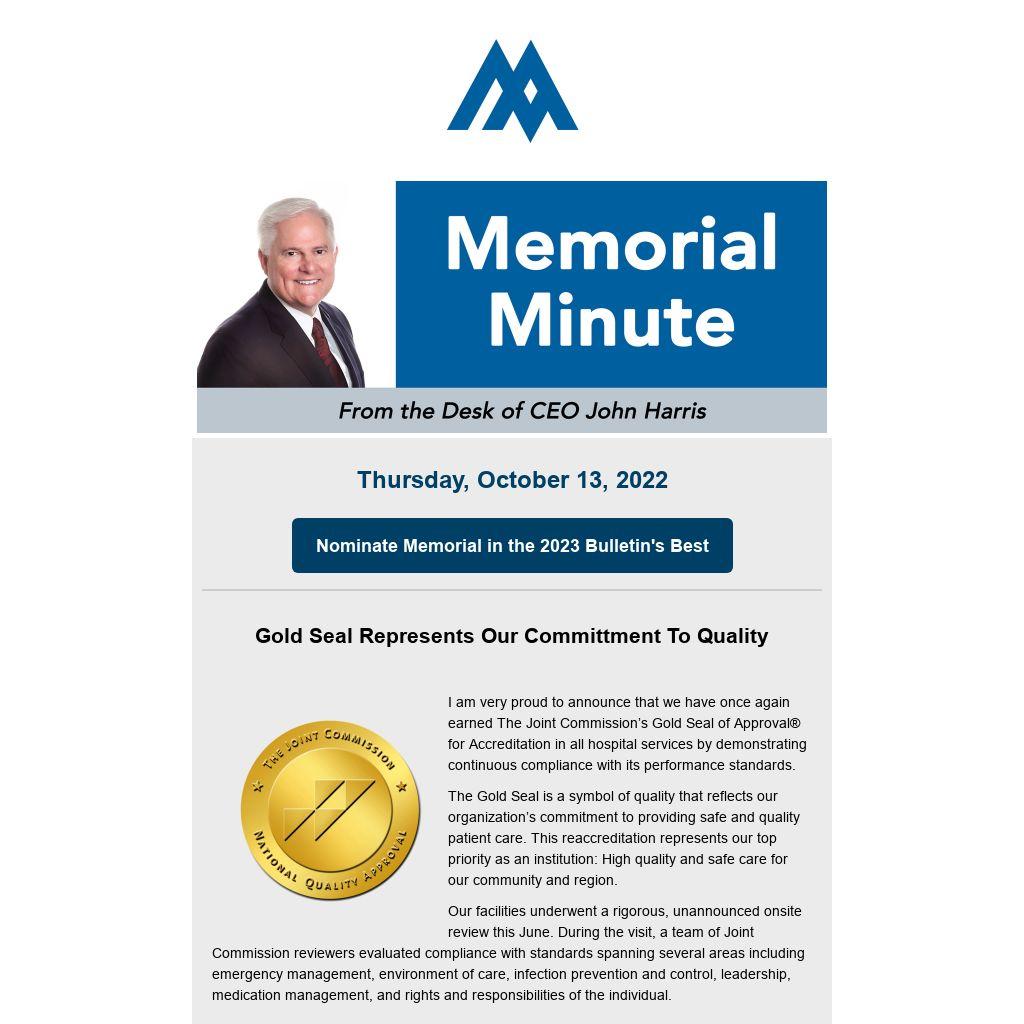 I am very proud to announce that we have once again earned The Joint Commission’s Gold Seal of Approval® for Accreditation in all hospital services by demonstrating continuous compliance with its performance standards.