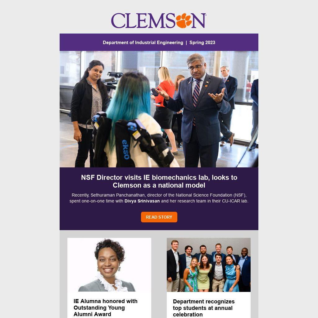 From the ChairAs we head toward the end of the Spring semester on campus, there is a sense of accomplished goals, chapters closing and anticipation of what the future holds for our graduates. Our continuing students have internships, co-ops and study abroad plans lined up, and our faculty are anxious to pour into their summer research…where they often make the most progress with their students. The staff has tirelessly supported the needs of the Department, and this is a time to celebrate how vital they are in making Clemson IE what it is today.It is such an exciting time of the year. Clemson IE remains a Top 20 graduate program among public universities (according to U.S. News and World Report), with several major research accomplishments. In this most recent year, we achieved our highest research expenditures ever, our faculty had the highest citation rate ever, and our faculty had their highest publication rate ever. Our reputation is also reflected in the job market for our graduates. Our graduating seniors either have jobs lined up, or they’re heading to graduate school. Recently, I attended our College and Department honors and awards nights, and we are blessed to have some of the best and brightest students from around the world. In this issue, you will find several faculty, staff, student and alumni highlights. Our newest faculty member, Jessica Aviles, had the opportunity to speak in Washington, D.C., at a congressional briefing. And the NSF director recently visited Divya Srinivasan’s lab, highlighting some of her innovative exoskeleton experiments. A combined faculty/student spotlight features Jackie Cha and Alec Gonzalez and their recent article in ISE Magazine. We are also very proud of the accomplishments of Angela Johnson Culver, who just received the Outstanding Young Alumni Award from the College of Engineering, Computing and Applied Sciences at Clemson. Angela gave the keynote speech this year at our IE End-of-Year Celebration, and it’s easy to see why she has been so successful in her career and life. What an inspiration! Graduation is just around the corner, and we have a few more events before the semester officially closes out. Please take time to visit any of our social media channels and keep in touch. Clemson IE has focused on improving how we share all of what is going on in the Department and beyond, and I hope you have been enjoying that!