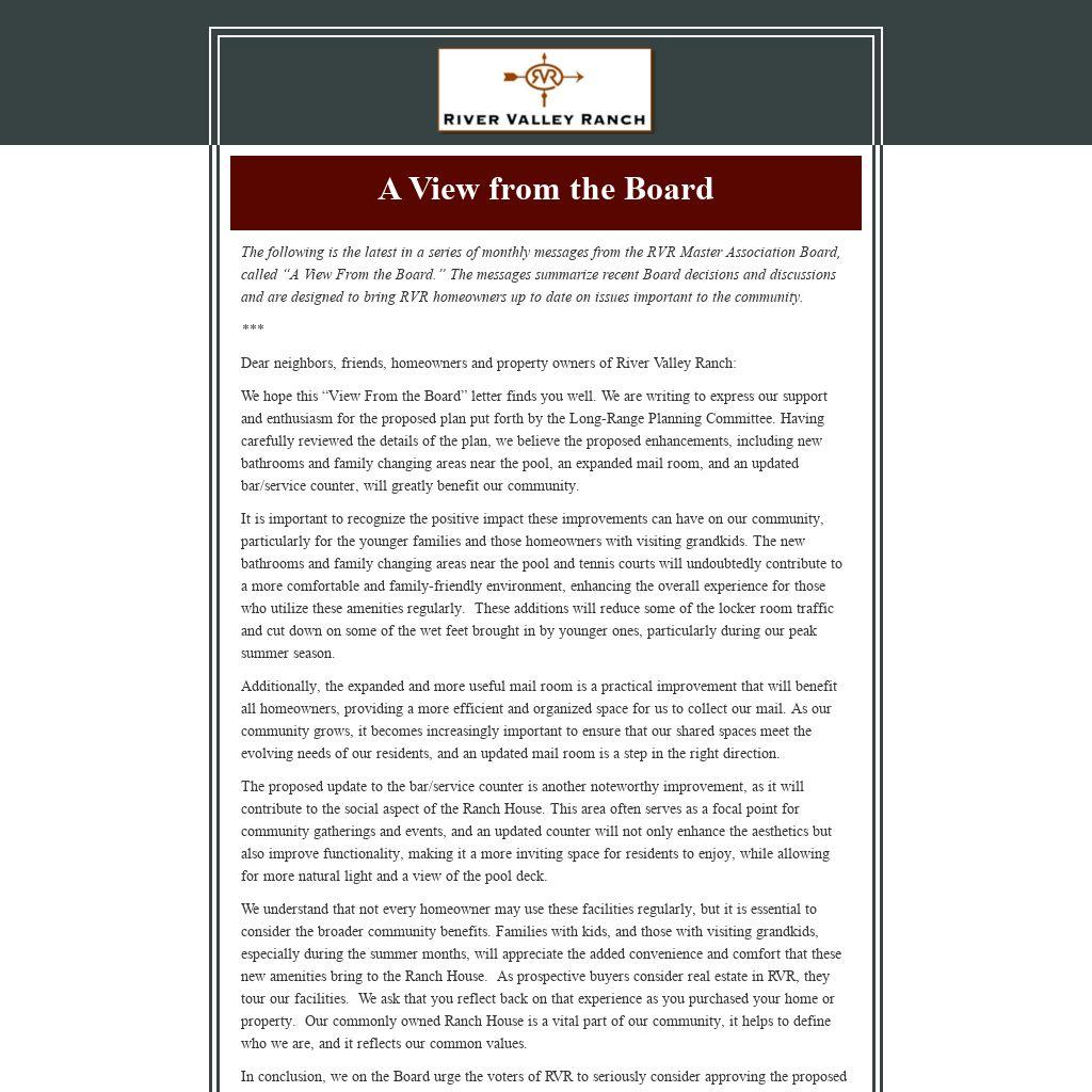 In conclusion, we on the Board urge the voters of RVR to seriously consider approving the proposed plan from the Long-Range Planning Committee. These enhancements align with the evolving needs of our community and will contribute to making the Ranch House a more convenient and comfortable place for all residents to gather and enjoy.