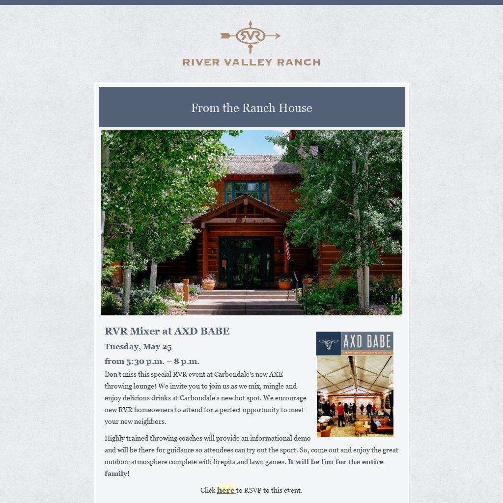 RVR Mixer at AXD BABE Tuesday, May 25 from 5:30 p.m. – 8 p.m. Don't miss this special RVR event at Carbondale's new AXE throwing lounge! We invite you to join us as we mix, mingle and enjoy delicious drinks at Carbondale's new hot spot. We encourage new RVR homeowners to attend for a perfect opportunity to meet your new neighbors.