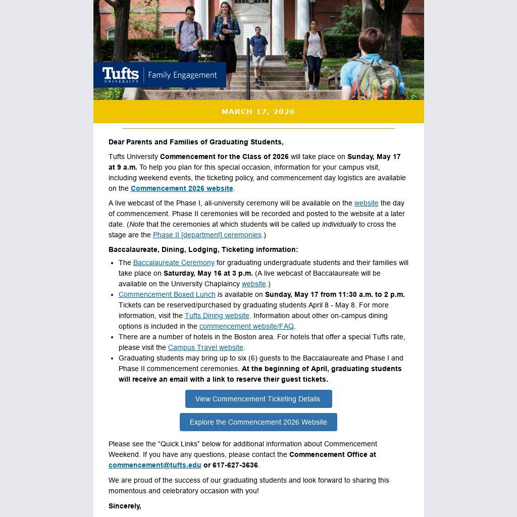Tufts University Commencement for the Class of 2026 will take place on Sunday, May 17 at 9 a.m. To help you plan for this special occasion, information for your campus visit, including weekend events, the ticketing policy, and commencement day logistics are available on the Commencement 2026 website.