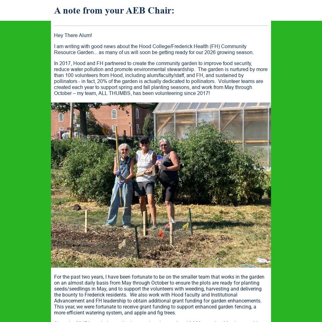 I am writing with good news about the Hood College/Frederick Health (FH) Community Resource Garden... as many of us will soon be getting ready for our 2026 growing season.