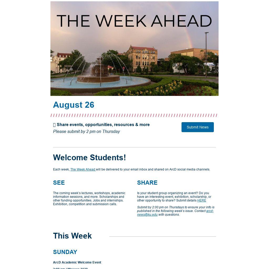 Submit by 2:00 pm on Thursdays to ensure your info is published in the following week’s issue. Contact arcd-news@ku.edu with questions.