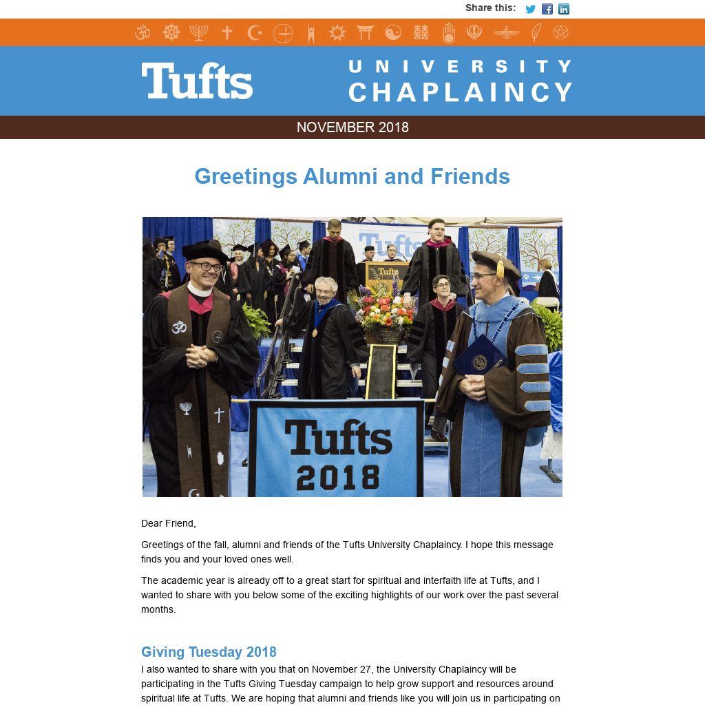 Giving Tuesday 2018I also wanted to share with you that on November 27, the University Chaplaincy will be participating in the Tufts Giving Tuesday campaign to help grow support and resources around spiritual life at Tufts. We are hoping that alumni and friends like you will join us in participating on that day. Participation is key, so gifts of any size are most welcome. Please follow our Giving Tuesday efforts and find the link to give by clicking here: