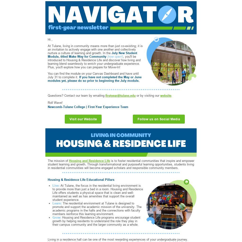 At Tulane, living in community means more than just co-existing; it is an invitation to actively engage with one another and collectively nurture a culture of learning and growth. In the July New Student Module, titled Make Way for Community (now open!), you'll be introduced to Housing & Residence Life and discover how living and learning blend seamlessly to enrich your undergraduate experience. Plus, you'll explore how you can prepare for Move-In!