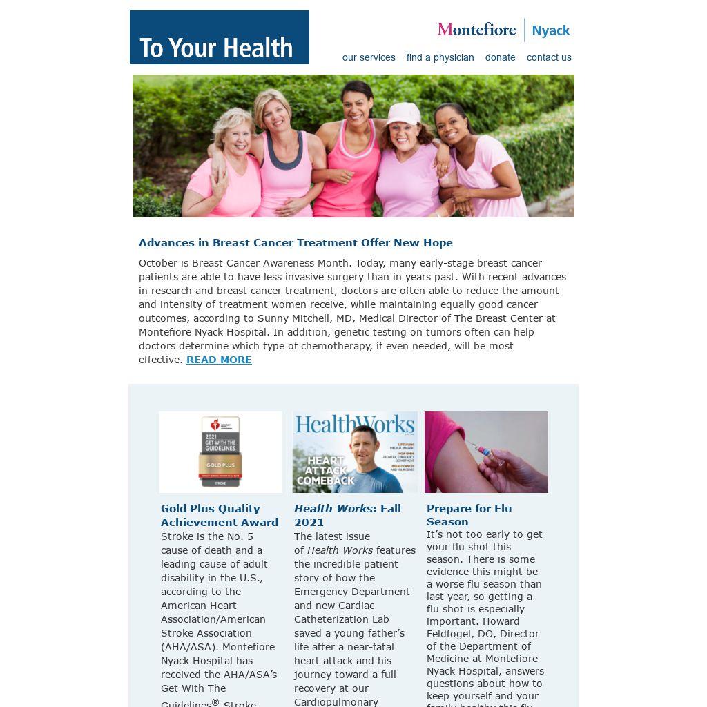 | The information provided by this enewsletter is intended to educate readers about subjects pertinent to their health. Consult your healthcare provider concerning how the information contained here relates to your personal health. Montefiore Nyack Hospital, a member of the Montefiore Health System, will not be held responsible for misuse of information stated in these resources.