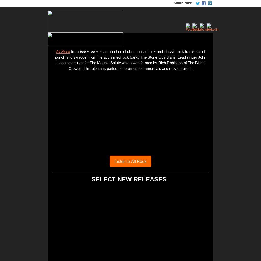 Alt Rockfrom Indiesonics is a collection of uber cool alt rock and classic rock tracks full of punch and swagger from the acclaimed rock band, The Stone Guardians. Lead singer John Hogg also sings for The Magpie Salute which was formed by Rich Robinson of The Black Crowes. This album is perfect for promos, commercials and movie trailers.