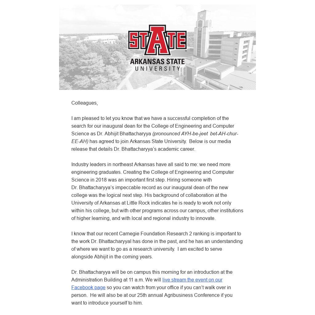 “Throughout the process, Dr. Bhattacharyya’s research set him apart academically,” A-State Provost Lynita Cooksey said, “but from the point of view of the provost, it also was his proven skill in working with other programs and even other universities to establish collaborative relationships that made him our strongest candidate to become dean. I think his experience working with both UA Little Rock’s graduate school and the research and technology transfer offices there makes him an exceptional ally for the professionals we have here on campus. I’m excited about the potential future collaborations with other academic programs and with the wider professional engineering and computer science community in our region he can facilitate.”