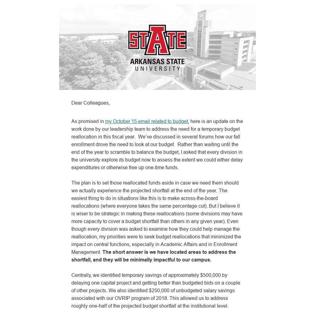 As promised in my October 15 email related to budget, here is an update on the work done by our leadership team to address the need for a temporary budget reallocation in this fiscal year. We’ve discussed in several forums how our fall enrollment drove the need to look at our budget. Rather than waiting until the end of the year to scramble to balance the budget, I asked that every division in the university explore its budget now to assess the extent we could either delay expenditures or otherwise free up one-time funds.