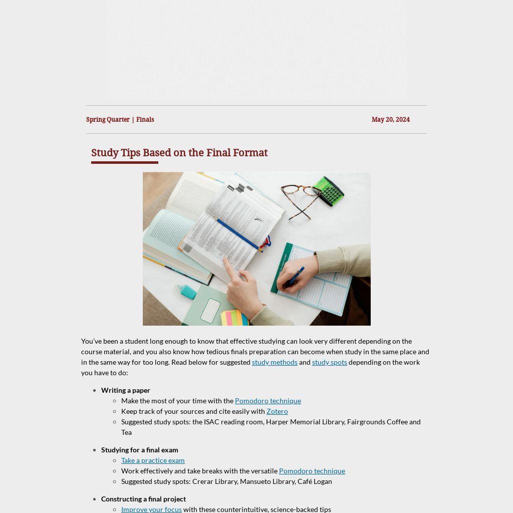 Suggested study spots: Logan Arts Center, McCormick Tribune Lounge in Reynolds Club, Hallowed Grounds Café