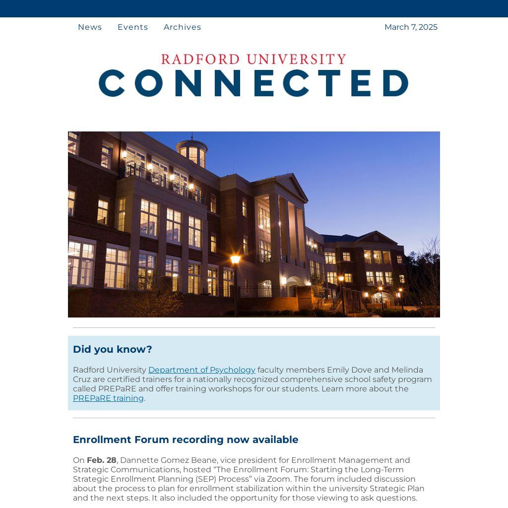 Radford University Department of Psychology faculty members Emily Dove and Melinda Cruz are certified trainers for a nationally recognized comprehensive school safety program called PREPaRE and offer training workshops for our students. Learn more about the PREPaRE training.