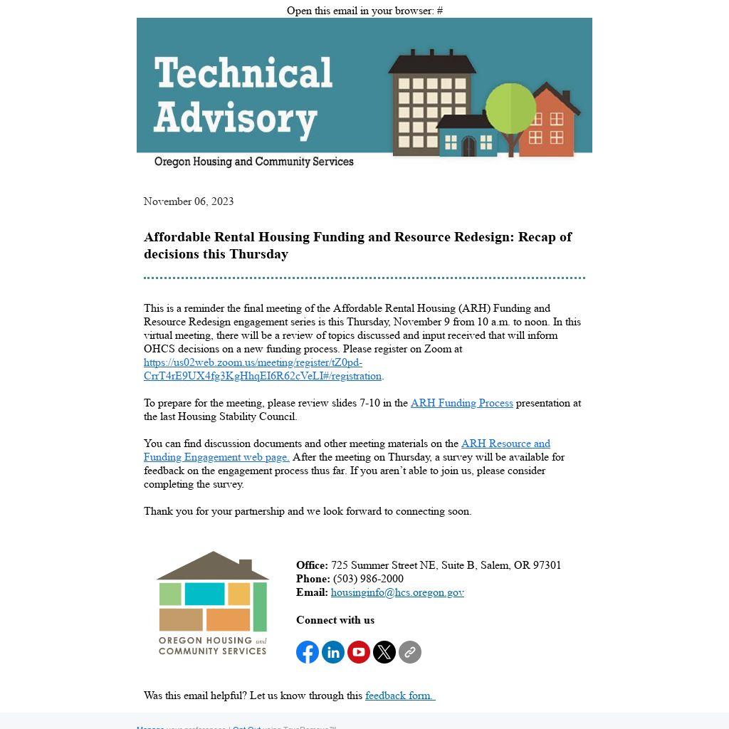 This is a reminder the final meeting of the Affordable Rental Housing (ARH) Funding and Resource Redesign engagement series is this Thursday, November 9 from 10 a.m. to noon. In this virtual meeting, there will be a review of topics discussed and input received that will inform OHCS decisions on a new funding process. Please register on Zoom at https://us02web.zoom.us/meeting/register/tZ0pd-CrrT4rE9UX4fg3KgHhqEI6R62cVeLI#/registration.