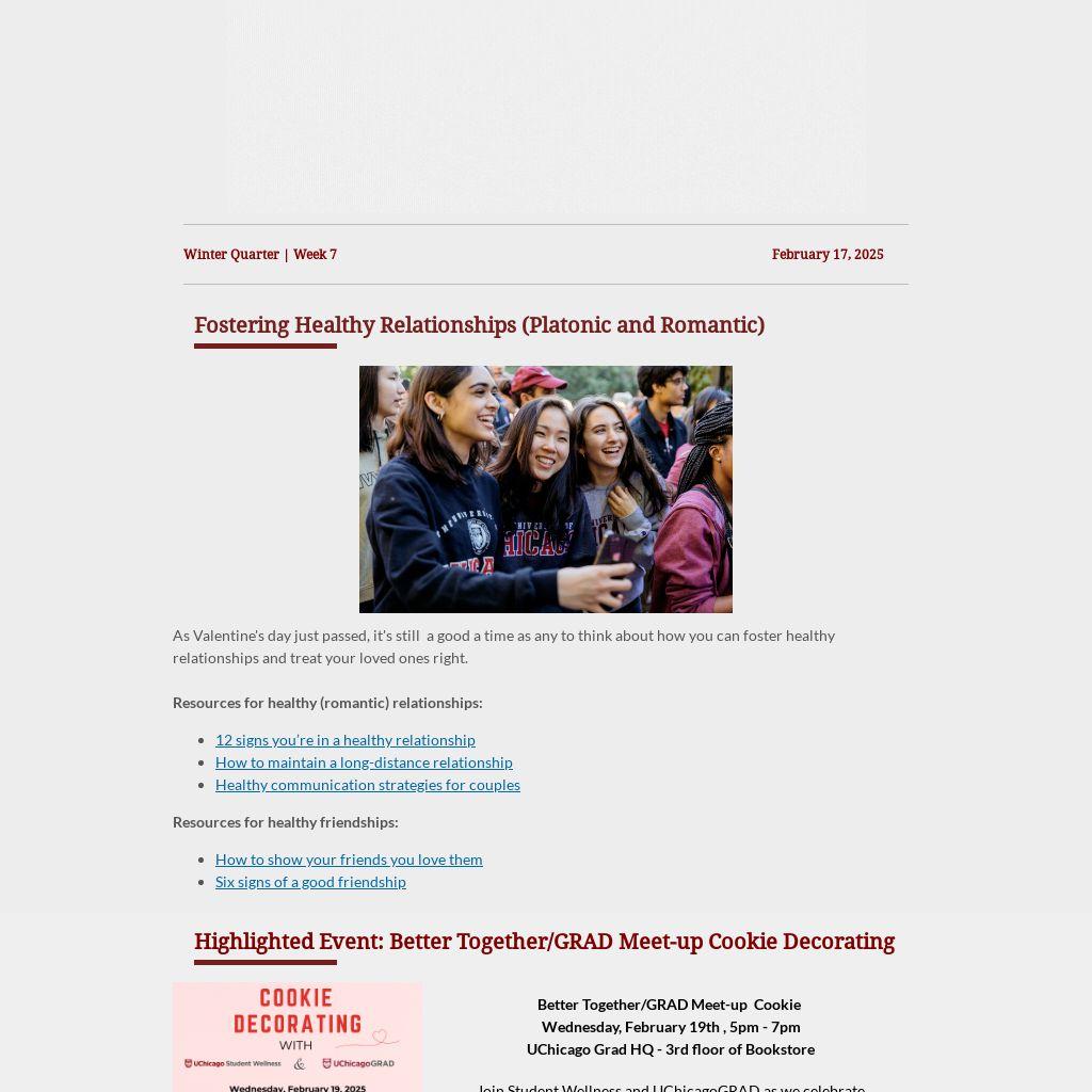 Join Student Wellness and UChicagoGRAD as we celebrate relationships in all forms! Valentine's day is for all to celebrate love, no matter romantic or platonic. Join us in a cookie decorating special and make new friends while you're at it. We look forward to seeing you!