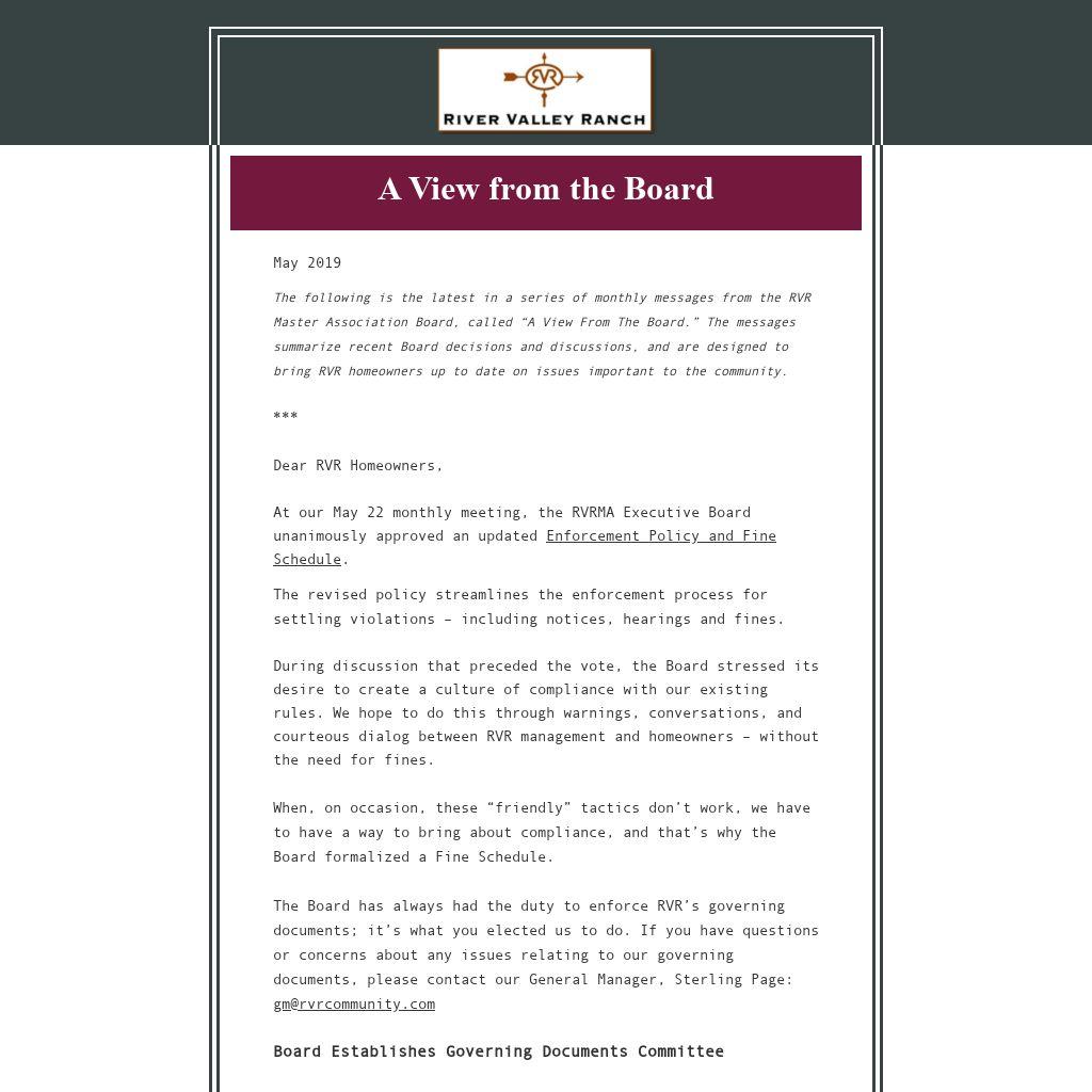 The Board has always had the duty to enforce RVR’s governing documents; it’s what you elected us to do. If you have questions or concerns about any issues relating to our governing documents, please contact our General Manager, Sterling Page: gm@rvrcommunity.com