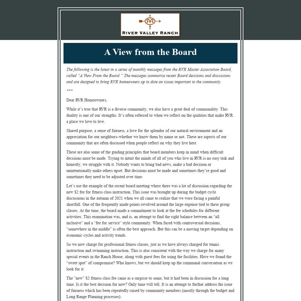 The following is the latest in a series of monthly messages from the RVR Master Association Board, called “A View From the Board.” The messages summarize recent Board decisions and discussions and are designed to bring RVR homeowners up to date on issues important to the community.
