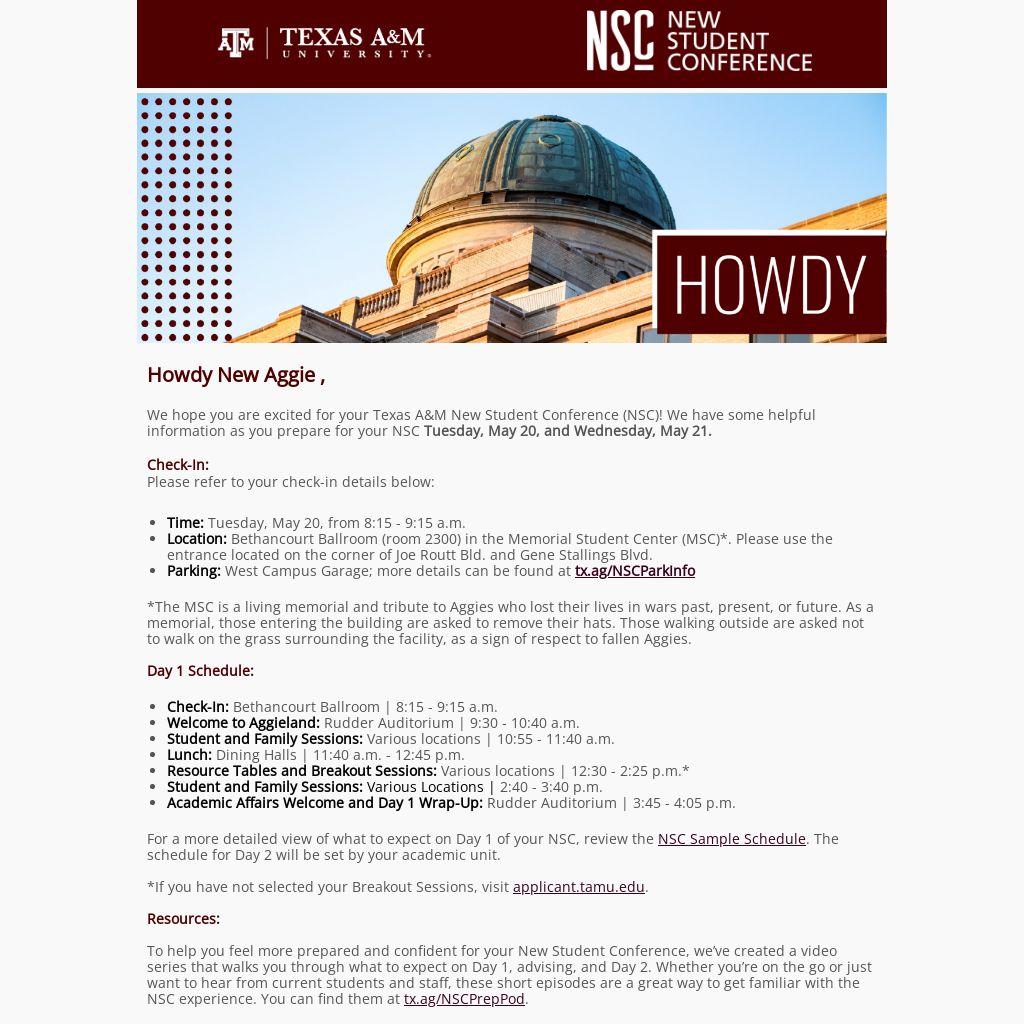 We hope you are excited for your Texas A&M New Student Conference (NSC)! We have some helpful information as you prepare for your NSC Tuesday, May 20, and Wednesday, May 21.