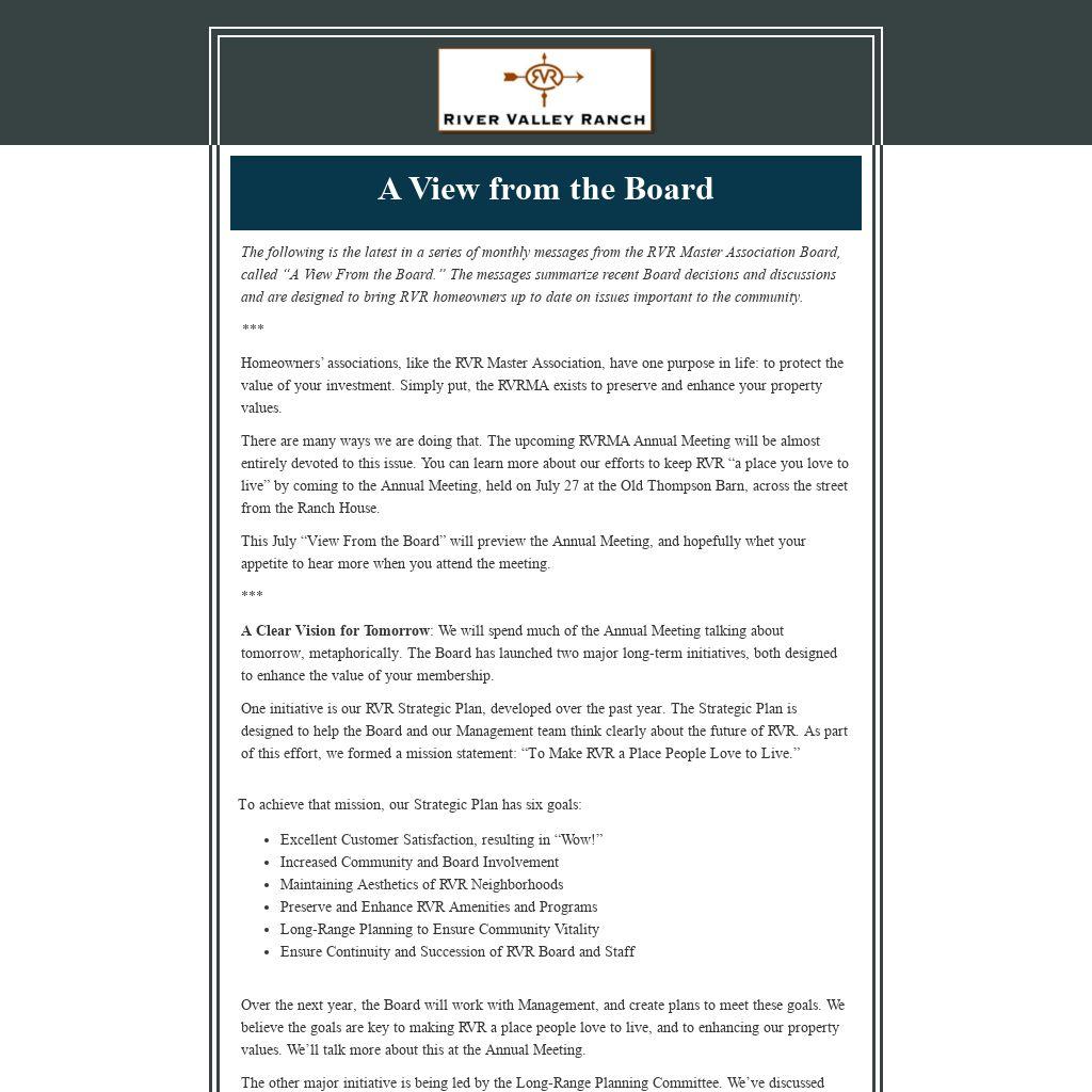 I believe the “Views From the Board” are meaningful tools in helping the 553 RVR property owners see that the Board is a responsible steward of their monthly assessments. And, these communications help show we are taking the necessary steps to protect the value of your home.