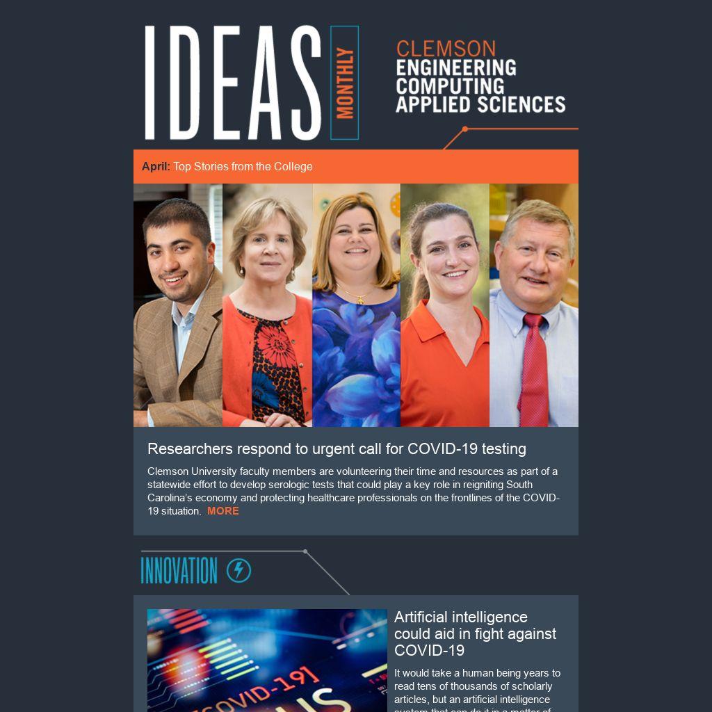 In early April we celebrated the achievements of several of our outstanding students. We honored some of the college’s top students for their excellence in academics, research and service, and a milestone of this semester is the graduation of our first Ph.D. student in biomedical data science and informatics, a program jointly offered by Clemson and the Medical University of South Carolina. You can read about their accomplishments in this issue as well as the innovative ways our faculty are holding online classes and dissertation defenses.