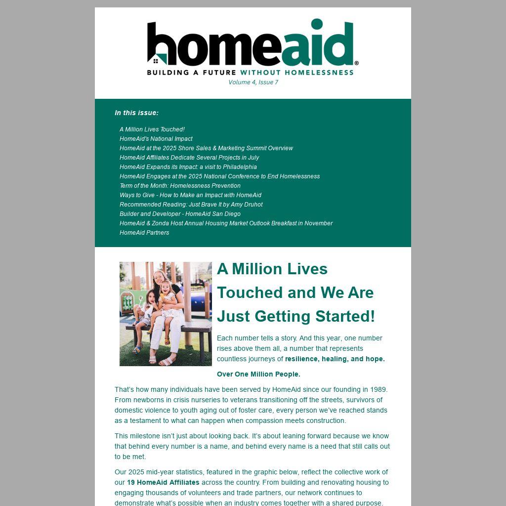That’s how many individuals have been served by HomeAid since our founding in 1989. From newborns in crisis nurseries to veterans transitioning off the streets, survivors of domestic violence to youth aging out of foster care, every person we’ve reached stands as a testament to what can happen when compassion meets construction.