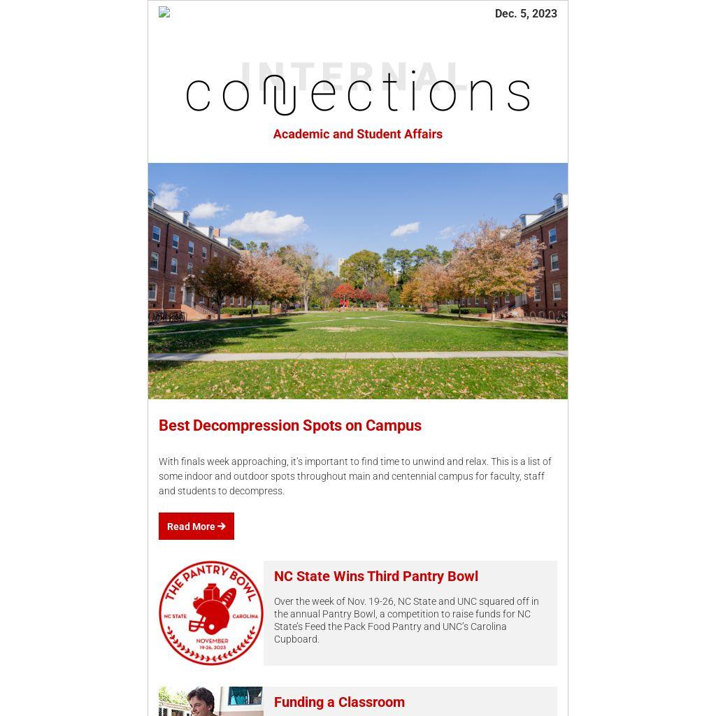 - The NC State Staff Senate will distribute warm winter clothing collected during the annual Winter Coat & Clothing Drive on Thursday, Dec. 7 from 10 a.m. to 2 p.m. at the Pack Essentials Hub, located in North Hall at 2200 Hillsborough St.