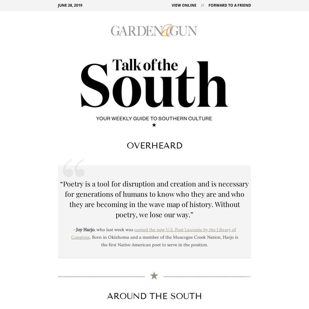 If you know a Southern artisan, let her or him know the deadline to enter the tenth annual Made in the South Awards is Monday, July 1. Winners and runners-up in six categories—food, drink, style, home, outdoors, and crafts—will appear in Garden & Gun, and the overall winner gets $10,000.