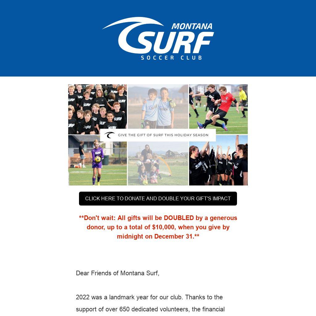 We could not do any of this without your help. Program fees only cover part of our expenses and we rely on a strong fundraising campaign to cover the rest. A Montana Surf family has offered to double your gift, up to $10,000, when you give by midnight on December 31, 2022. Please consider joining us in making a donation to Montana Surf. Thank you for your generous support and we wish you a happy and healthy holiday season!