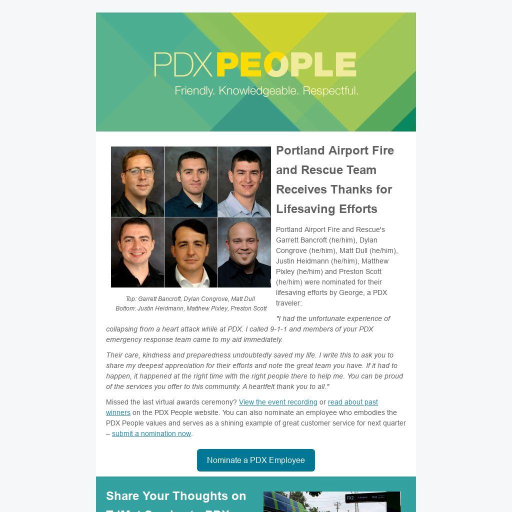 Portland Airport Fire and Rescue's Garrett Bancroft (he/him), Dylan Congrove (he/him), Matt Dull (he/him), Justin Heidmann (he/him), Matthew Pixley (he/him) and Preston Scott (he/him) were nominated for their lifesaving efforts by George, a PDX traveler: