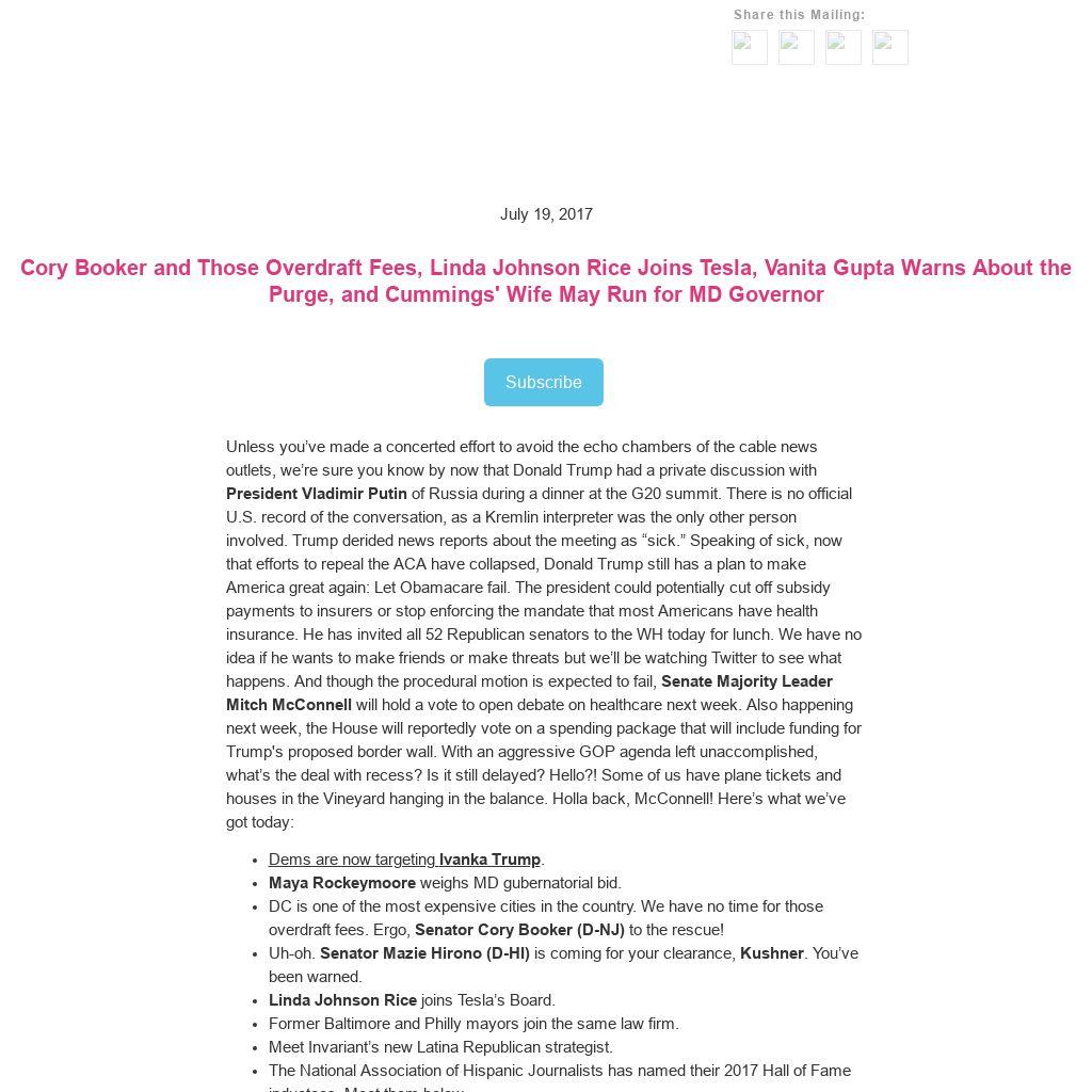 Unless you’ve made a concerted effort to avoid the echo chambers of the cable news outlets, we’re sure you know by now that Donald Trump had a private discussion with President Vladimir Putin of Russia during a dinner at the G20 summit. There is no official U.S. record of the conversation, as a Kremlin interpreter was the only other person involved. Trump derided news reports about the meeting as “sick.” Speaking of sick, now that efforts to repeal the ACA have collapsed, Donald Trump still has a plan to make America great again: Let Obamacare fail. The president could potentially cut off subsidy payments to insurers or stop enforcing the mandate that most Americans have health insurance. He has invited all 52 Republican senators to the WH today for lunch. We have no idea if he wants to make friends or make threats but we’ll be watching Twitter to see what happens. And though the procedural motion is expected to fail, Senate Majority Leader Mitch McConnell will hold a vote to open debate on healthcare next week. Also happening next week, the House will reportedly vote on a spending package that will include funding for Trump's proposed border wall. With an aggressive GOP agenda left unaccomplished, what’s the deal with recess? Is it still delayed? Hello?! Some of us have plane tickets and houses in the Vineyard hanging in the balance. Holla back, McConnell! Here’s what we’ve got today:- Dems are now targeting Ivanka Trump.