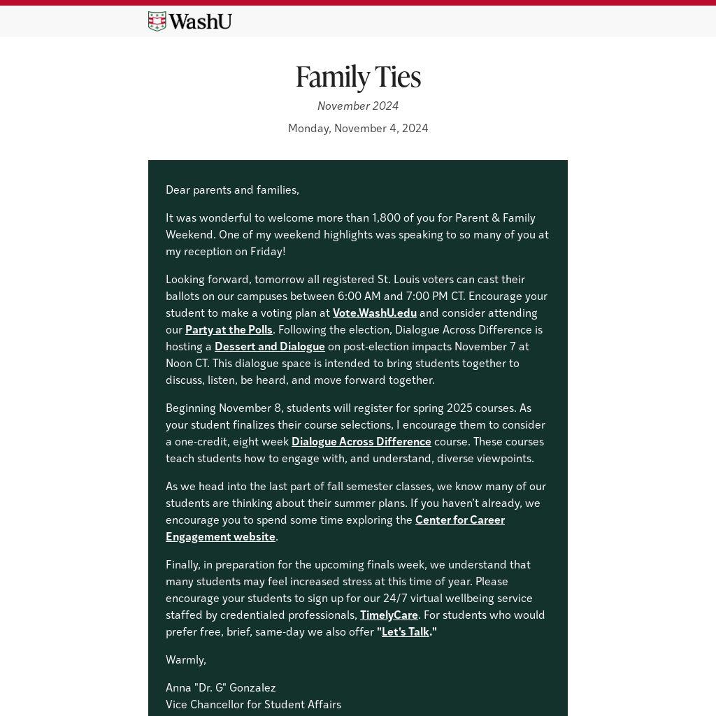 Looking forward, tomorrow all registered St. Louis voters can cast their ballots on our campuses between 6:00 AM and 7:00 PM CT. Encourage your student to make a voting plan at Vote.WashU.edu and consider attending our Party at the Polls. Following the election, Dialogue Across Difference is hosting a Dessert and Dialogue on post-election impacts November 7 at Noon CT. This dialogue space is intended to bring students together to discuss, listen, be heard, and move forward together.