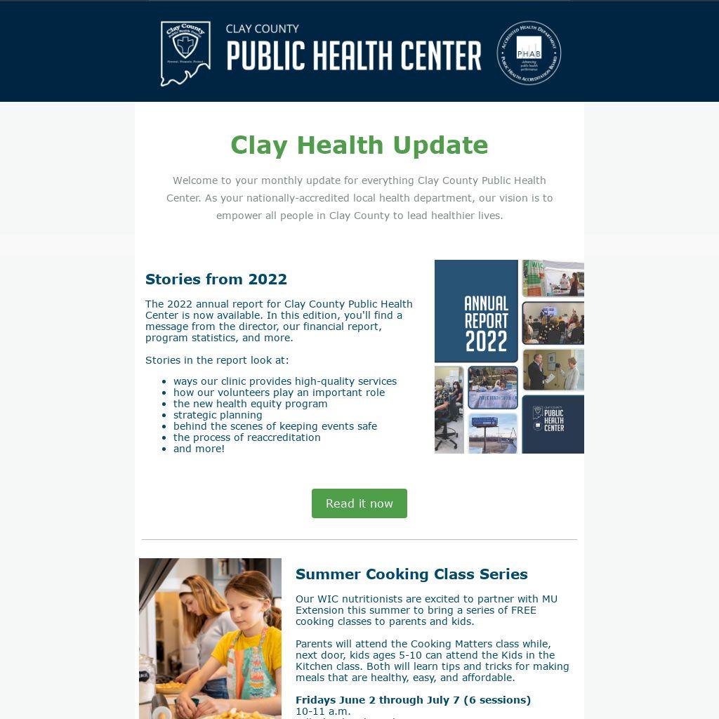 Welcome to your monthly update for everything Clay County Public Health Center. As your nationally-accredited local health department, our vision is to empower all people in Clay County to lead healthier lives.