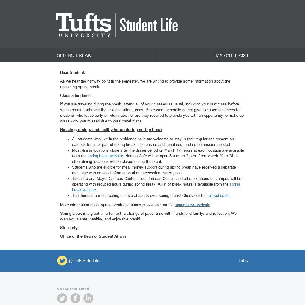 As we near the halfway point in the semester, we are writing to provide some information about the upcoming spring break.