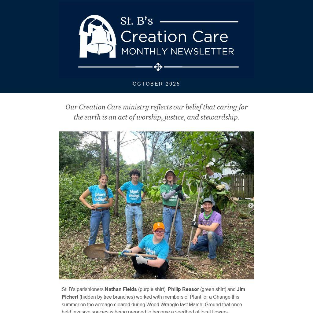Christians around the world celebrate something called the Season of Creation every fall. This year it runs from September 1 through October 4, and the theme is “Peace with creation.” St. B’s hopes to officially participate next year!