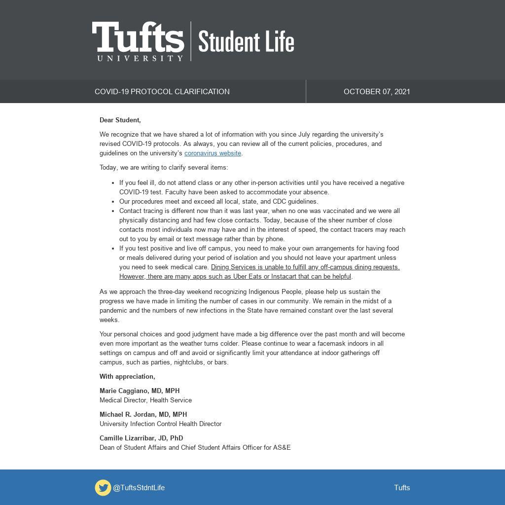 We recognize that we have shared a lot of information with you since July regarding the university’s revised COVID-19 protocols. As always, you can review all of the current policies, procedures, and guidelines on the university’s coronavirus website.