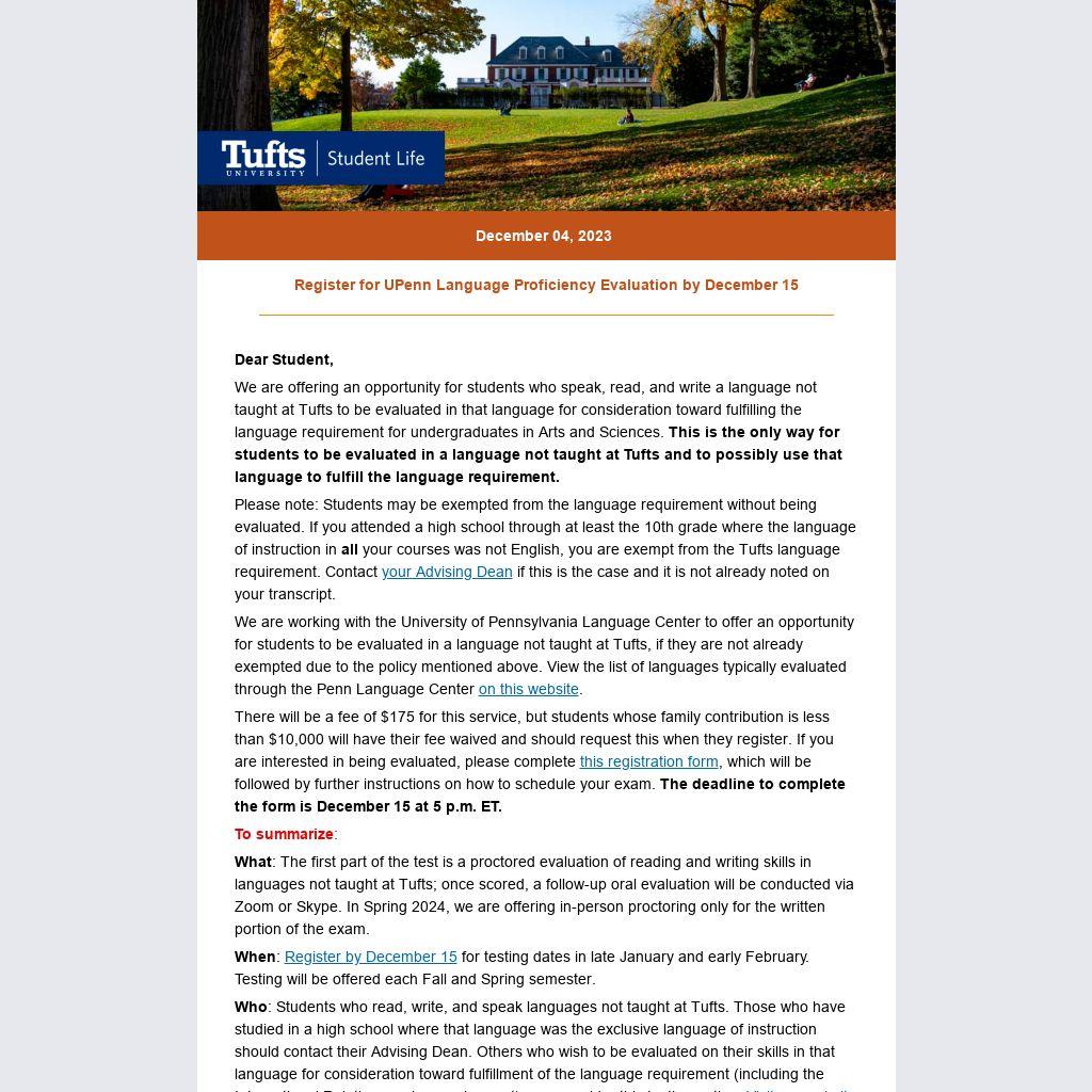 Who: Students who read, write, and speak languages not taught at Tufts. Those who have studied in a high school where that language was the exclusive language of instruction should contact their Advising Dean. Others who wish to be evaluated on their skills in that language for consideration toward fulfillment of the language requirement (including the International Relations major requirement) may consider this testing option. Visit our website for more details on options for fulfilling the language requirement.