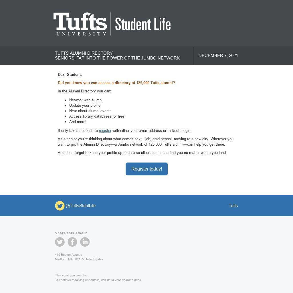 As a senior you’re thinking about what comes next—job, grad school, moving to a new city. Wherever you want to go, the Alumni Directory—a Jumbo network of 125,000 Tufts alumni—can help you get there.