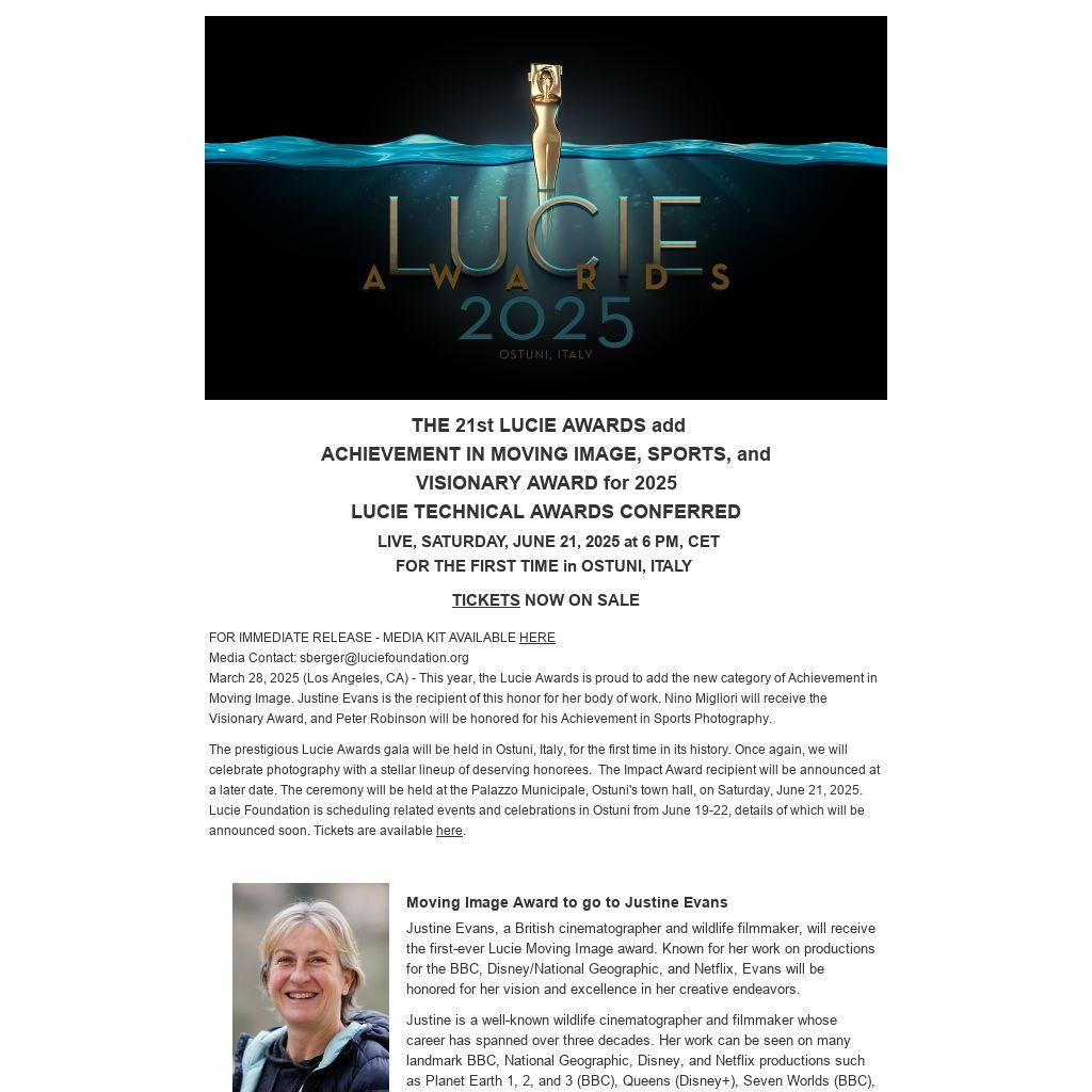 FOR IMMEDIATE RELEASE - MEDIA KIT AVAILABLE HERE Media Contact: sberger@luciefoundation.org March 28, 2025 (Los Angeles, CA) - This year, the Lucie Awards is proud to add the new category of Achievement in Moving Image. Justine Evans is the recipient of this honor for her body of work. Nino Migliori will receive the Visionary Award, and Peter Robinson will be honored for his Achievement in Sports Photography.