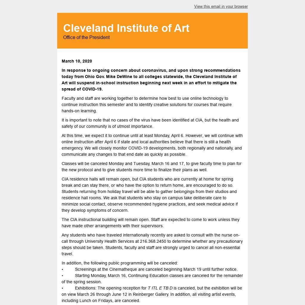 In response to ongoing concern about coronavirus, and upon strong recommendations today from Ohio Gov. Mike DeWine to all colleges statewide, the Cleveland Institute of Art will suspend in-school instruction beginning next week in an effort to mitigate the spread of COVID-19.